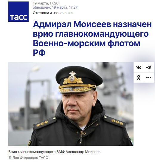 中新网3月20日电据塔斯社报道,当地时间19日,俄海军上将莫伊谢耶夫在出席潜艇兵日庆祝活动时,被以“俄罗斯海军代总司令”的职务介绍给来宾。俄媒称,这是莫伊谢耶夫首次被正式介绍为“海军代总司令”。
