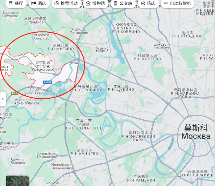 克拉斯诺戈尔斯克市,由莫斯科州管辖,位于莫斯科西北约22公里,在莫斯科河畔(红圈处)