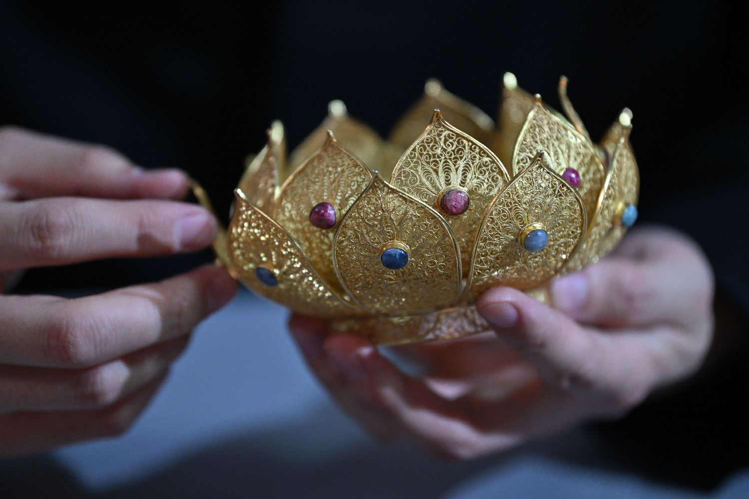 如今,马赛注册成立了个人品牌工作室,学徒也渐渐多了起来。“我希望有更多年轻力量加入到这个队伍中,做出属于我们这一代的花丝镶嵌作品。”马赛对这项技艺的未来充满信心。图为马赛在工作室内制作莲花冠。(新华社)