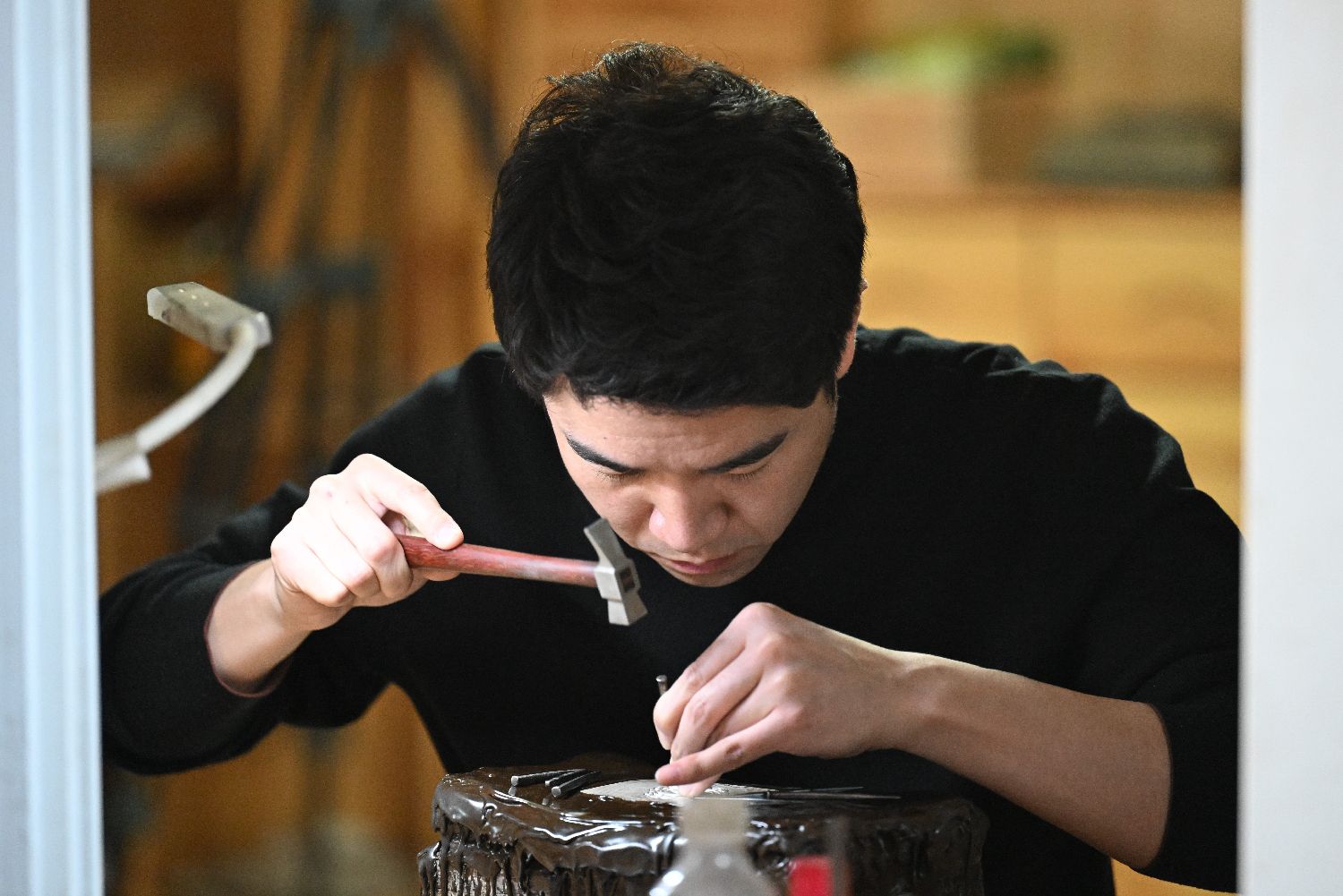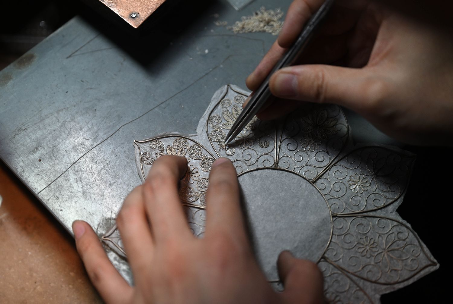 “制作步骤环环相扣,需要沉得下心,坐得下去。”通过日积月累的一遍遍练习,马赛的技艺日渐精进。图为马赛在工作室内錾刻。(新华社)