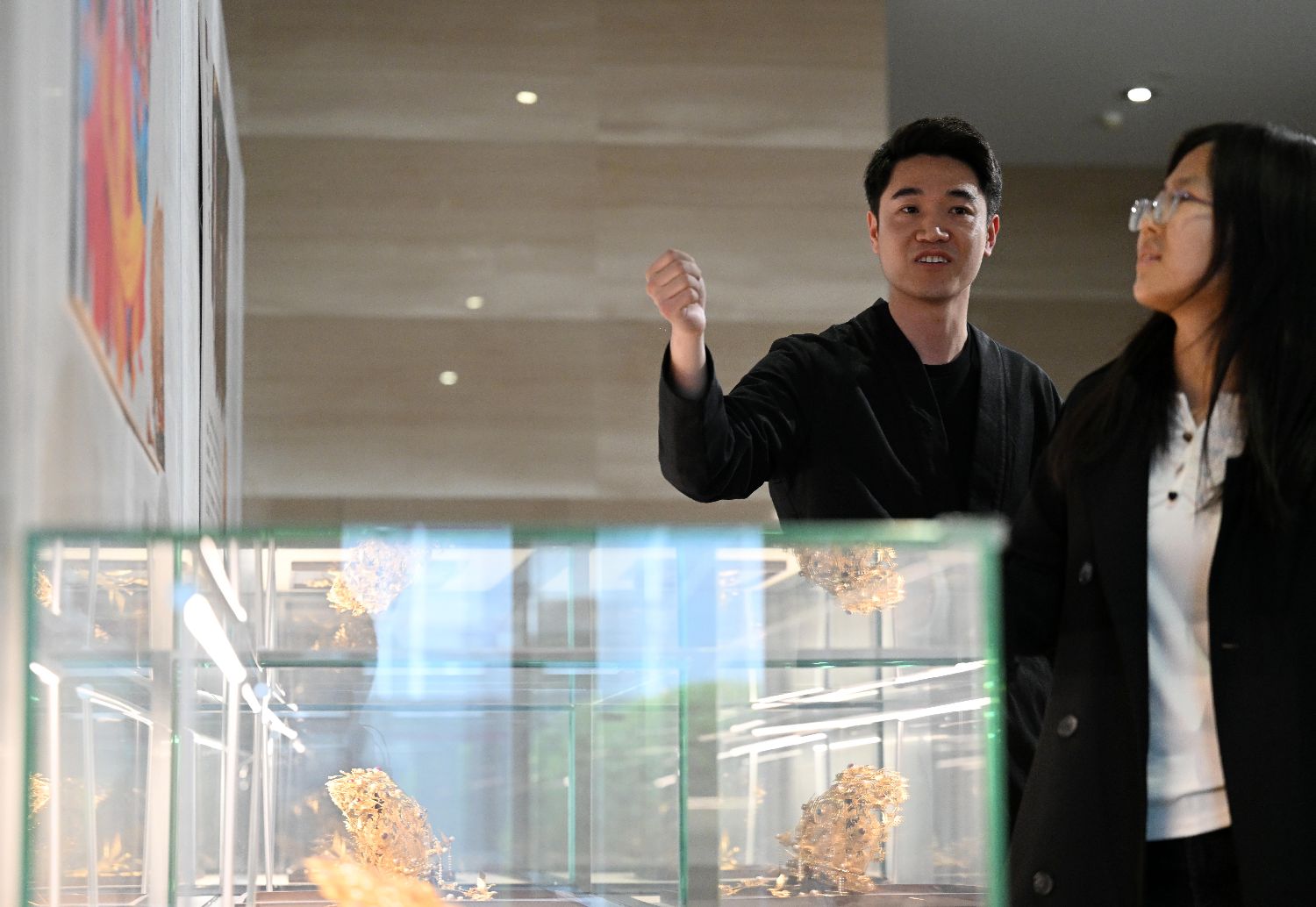 马赛在天津市武清区博物馆向参观马氏花丝镶嵌制作技艺专题展的观众介绍展品。(新华社)