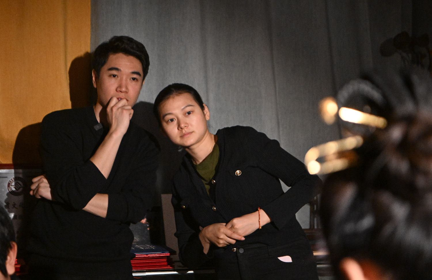 马赛(左)在工作室内与女朋友闵方苹在汉服爱好者佩戴头饰时商讨制作细节。(新华社)