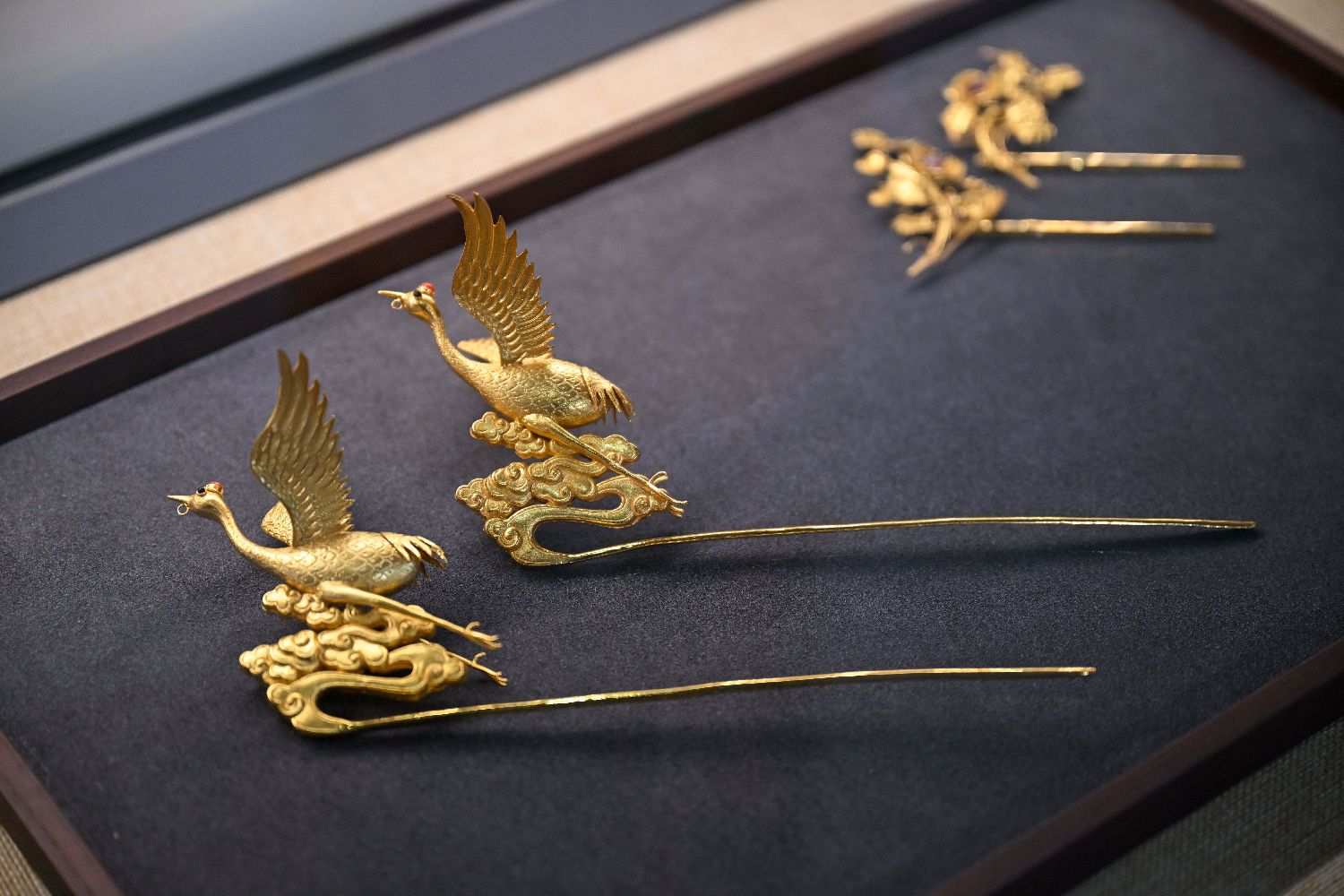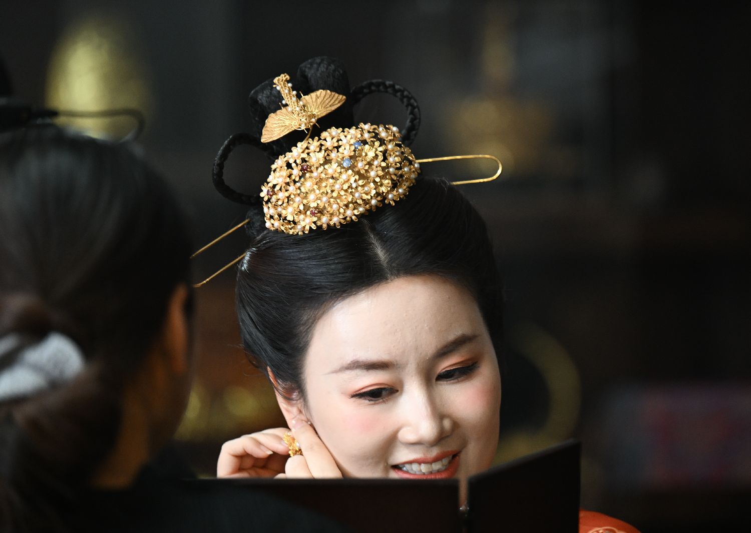 为了让这项古老的技艺重新焕发光彩,马赛还在传承传统技艺的基础上,巧妙融入“国潮”元素,借助汉服兴起的东风,将花丝镶嵌与传统汉服文化以及现代婚礼相结合,把这项“老古董”做成了日常佩戴饰品,产品受到了越来越多年轻人的喜爱。图为一名汉服爱好者在马赛的工作室内试戴花丝镶嵌技艺制作的头饰。(新华社)