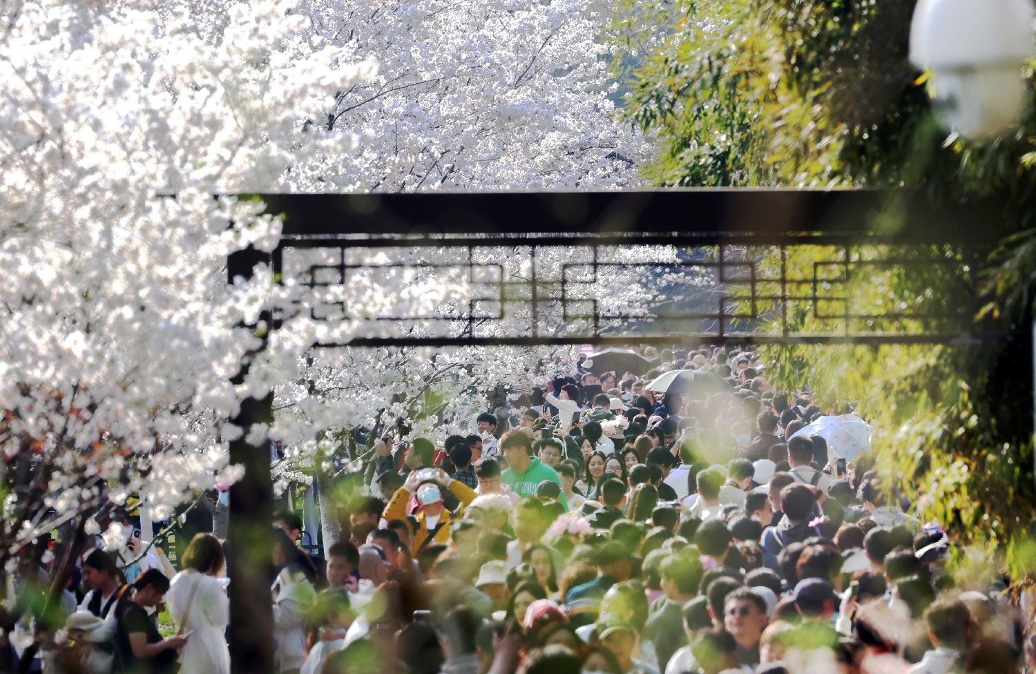 2024年3月31日,北京玉渊潭公园樱花树下挤满了大批前往赏花的游客。(郑闻 摄)