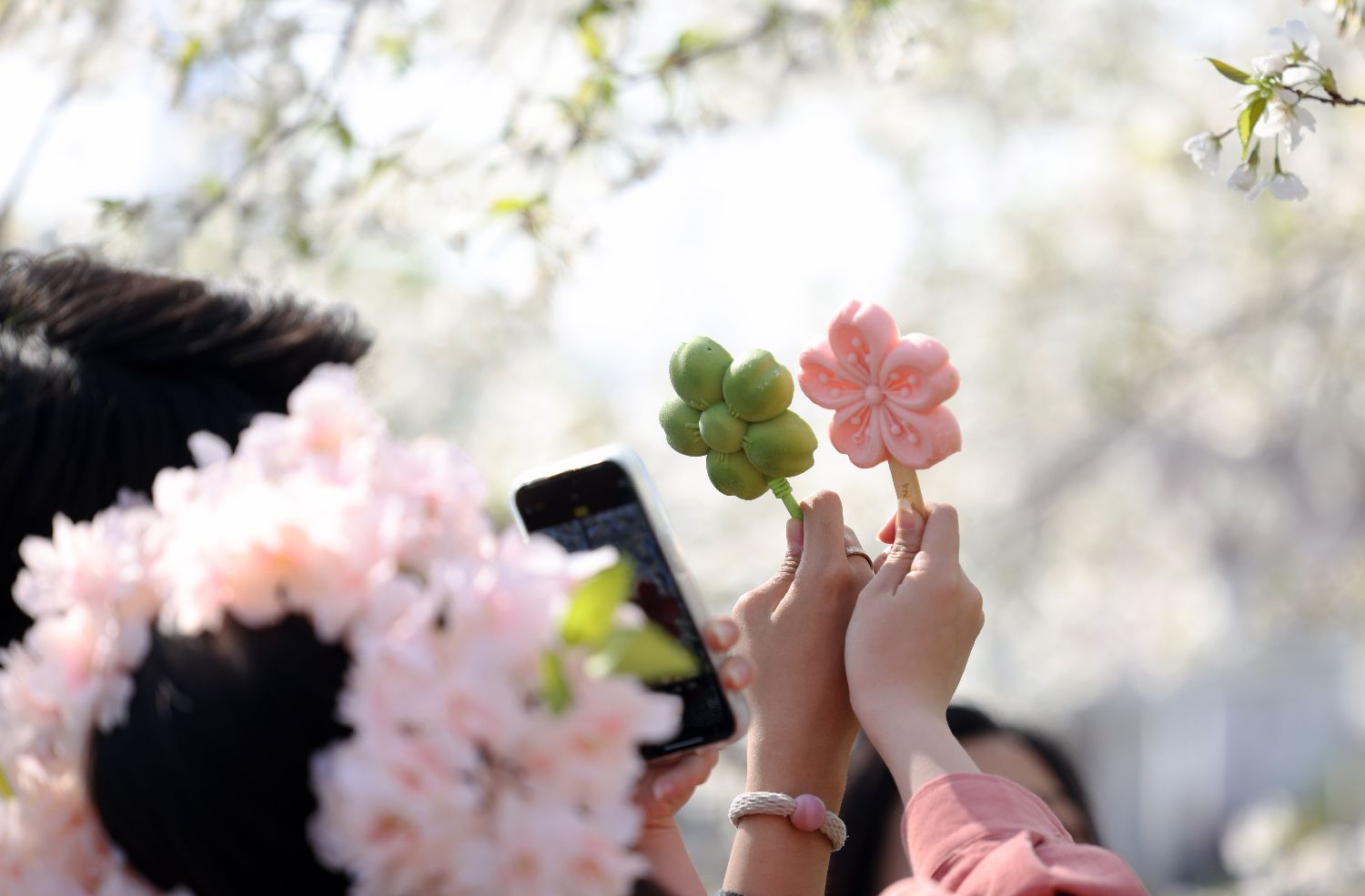 2024年3月31日,游客在北京玉渊潭公园手持樱花冰激凌拍摄。(郑闻 摄)