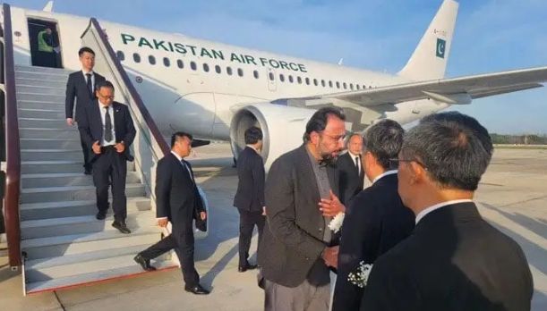 4月1日, 护送在“3·26”恐袭案中遇难的5位中国公民遗体的巴基斯坦军机抵达武汉。图为巴侨务与人力资源发展部部长乔杜里·萨利克·侯赛因下飞机后与中方官员交谈。(图/巴基斯坦驻中国大使馆网站)