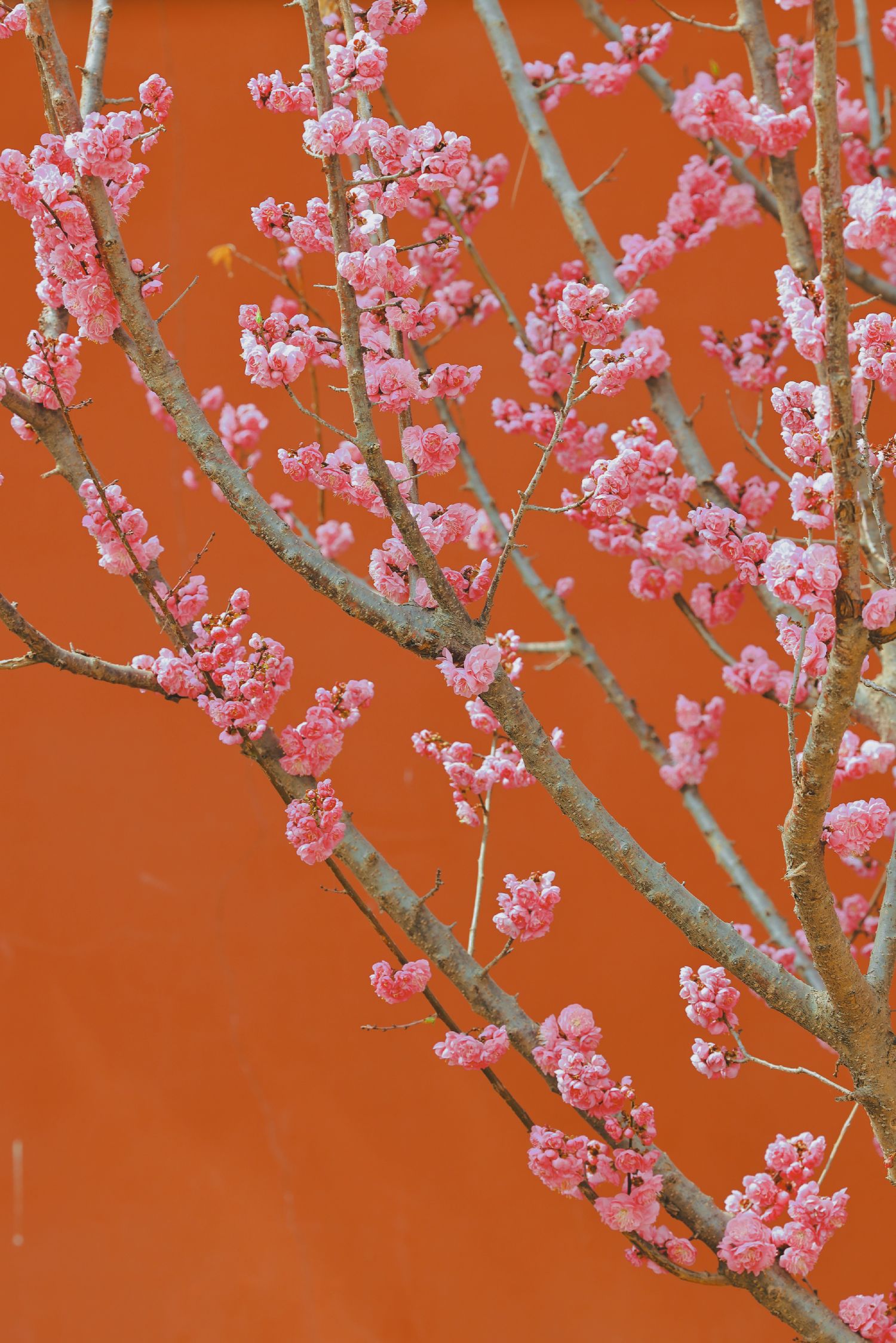 2024年4月2日,一树梅花在故宫红墙的映衬下格外醒目。 (王亚霓 摄)