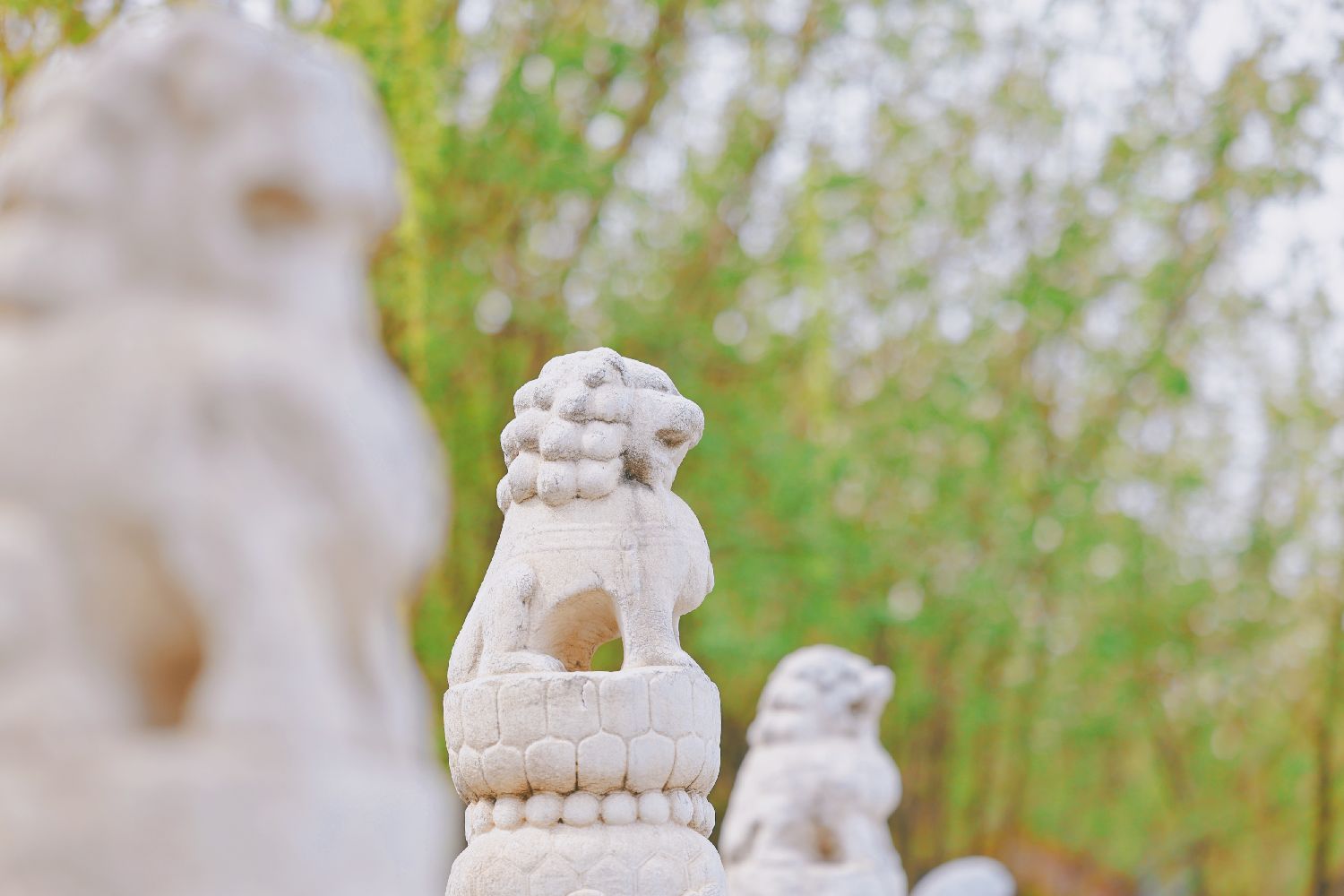 2024年4月2日,北京故宫博物院东华门石狮子身后绿意盎然。 (王亚霓 摄)