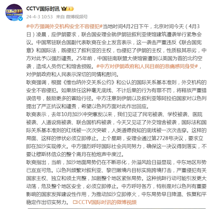 耿爽强调,根据《维也纳外交关系公约》和公认的国际关系基本准则,外交机构的安全不容侵犯。如果放任这种毫无底线、不计后果的行为有罪不罚,将释放严重错误信号,鼓励更多的冒险行径。中方注意到伊朗以及叙利亚等阿拉伯国家对以色列提出了严正抗议和谴责,希望以色列方面对此作出回应。