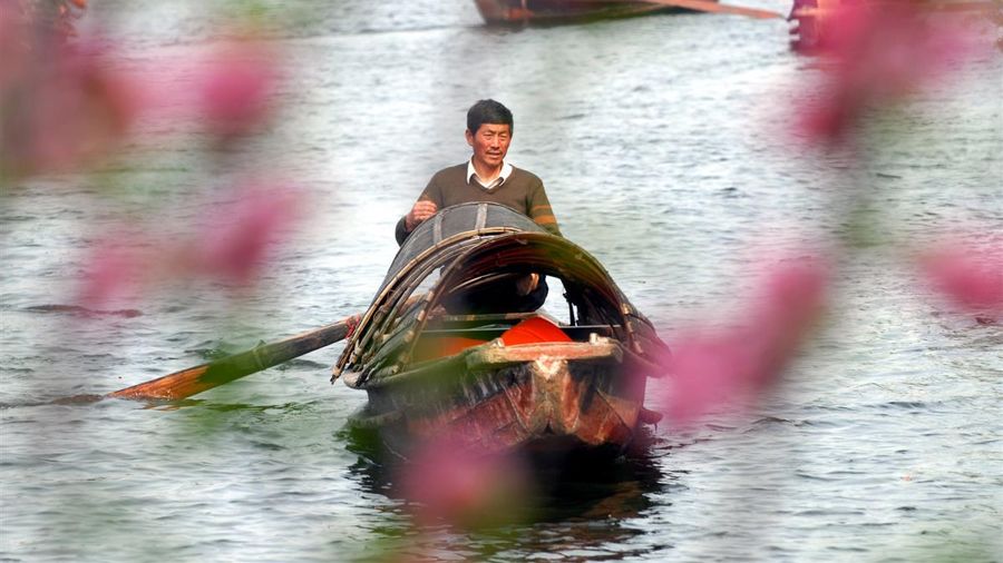 船老大唐国良,在东湖已经工作11年了。平时工作,他都穿着一身青衣小褂,接待游客,双脚用力往前一蹬船桨,带着小船缓慢向前驶去。遇到狭窄洞口,双手拨动划桨,轻松转弯。