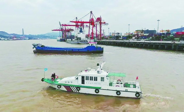 9日,鑫龙996号货轮在“海巡08205”艇的护航下顺利从马尾青州码头出发。(图/福州《福建日报》)