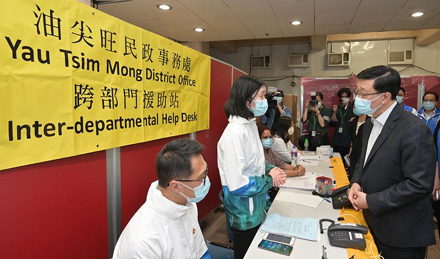 10日,李家超到伊利沙伯医院探望火灾伤者。图为李家超(右一)视察医院内的跨部门援助站。(图/中新社)