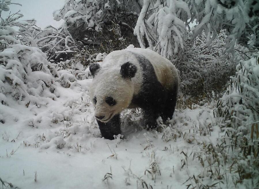 在红外相机拍摄的图片资料中,被白雪覆盖的千佛山显得格外静谧,一只野生大熊猫慢悠悠地踏雪而来,穿越过树枝蹭到的雪堆像是给自己披上了一层银装,憨态可掬。