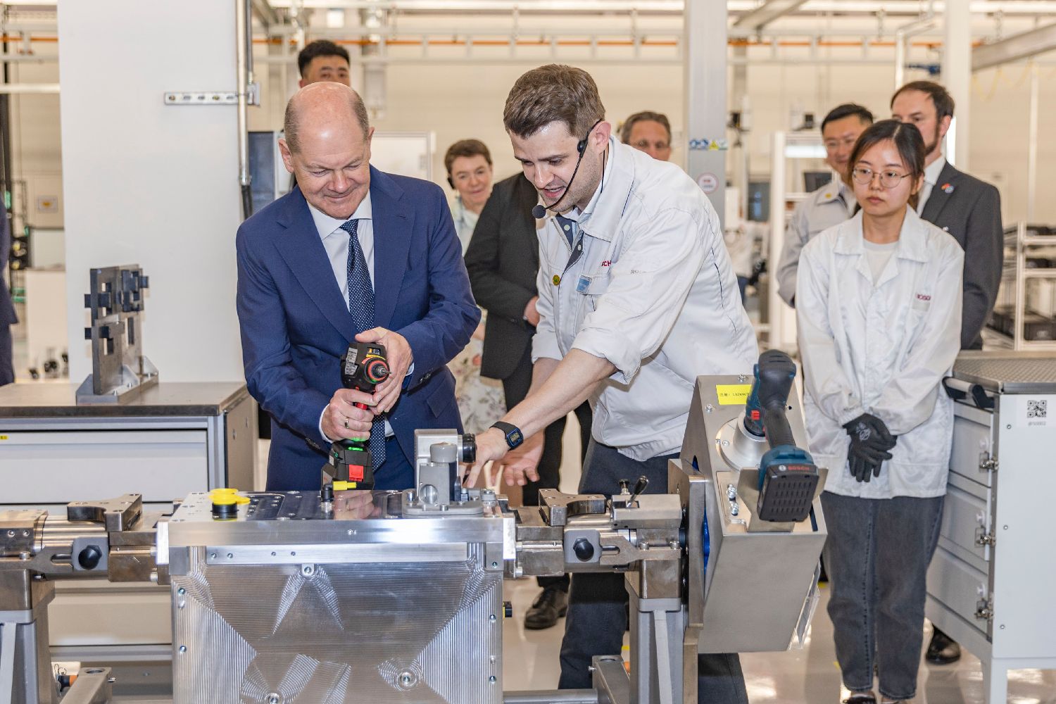 4月14日,德国总理朔尔茨在位于重庆市九龙坡区的博世氢动力系统(重庆)有限公司参访。(图/新华社)