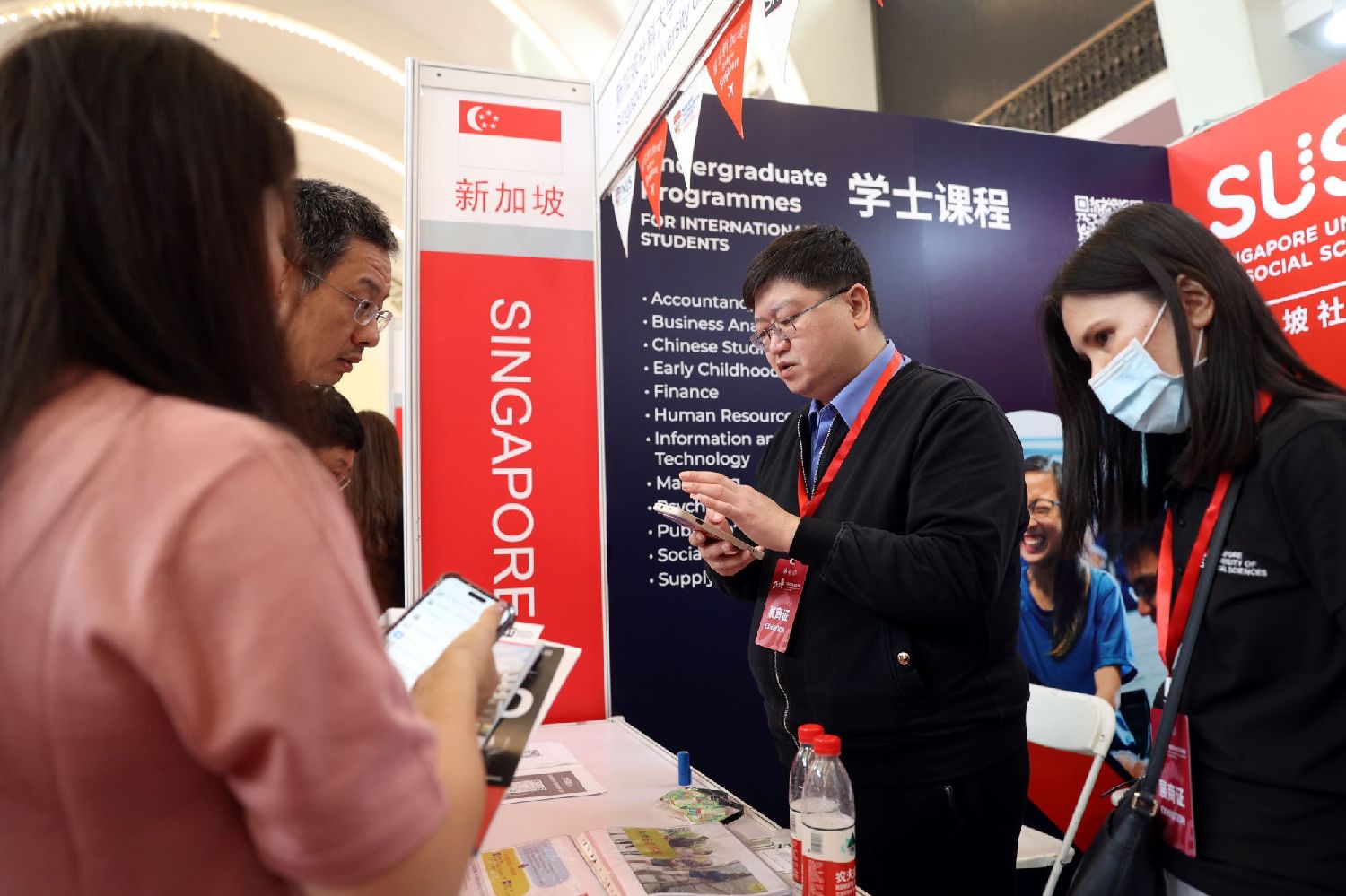 在新加坡展团展台前,前来咨询的学生和家长络绎不绝,普遍关心新加坡各大高校的录取标准、专业设置、奖学金政策等细节问题,希望为留学之路做好充分准备。