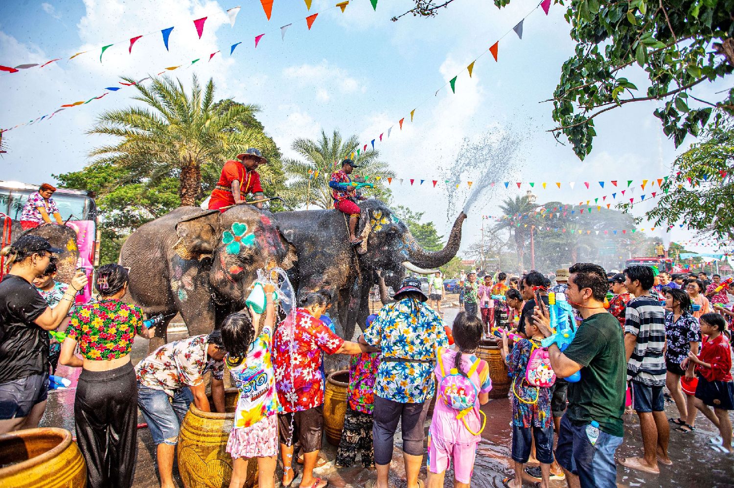图为4月13日,在泰国大城府,人们与大象泼水庆祝宋干节。(图/新华社)