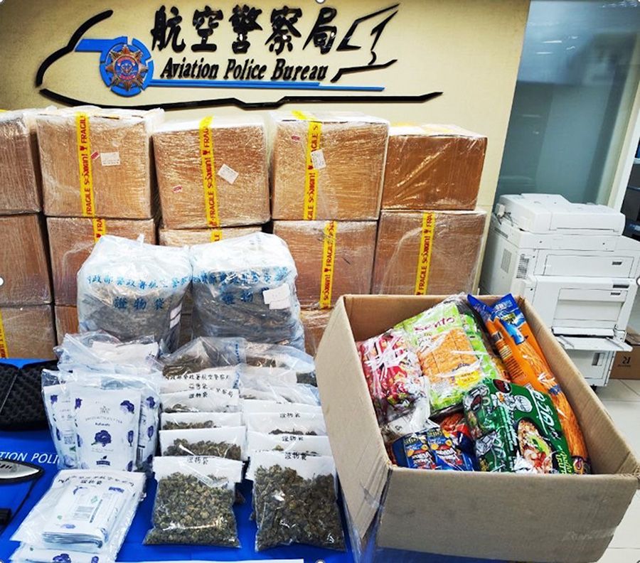 3月21日,台湾桃园机场航空警察局与台北海关宣布,近日逮捕两名嫌犯,企图以泰国畅销蝶豆花包装内夹藏14.168公斤大麻花闯关,市价高达新台币数千万元。(图/香港中通社)