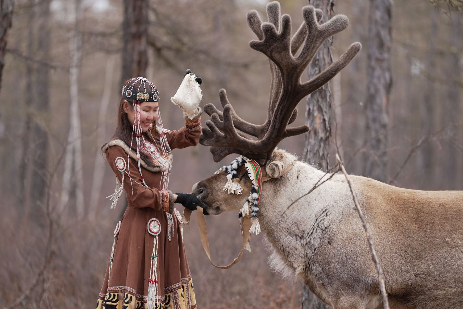 4月20日,鄂温克使鹿人阿尤莎正在给驯鹿喂矿物盐,为其补充能量。(图/中新社)