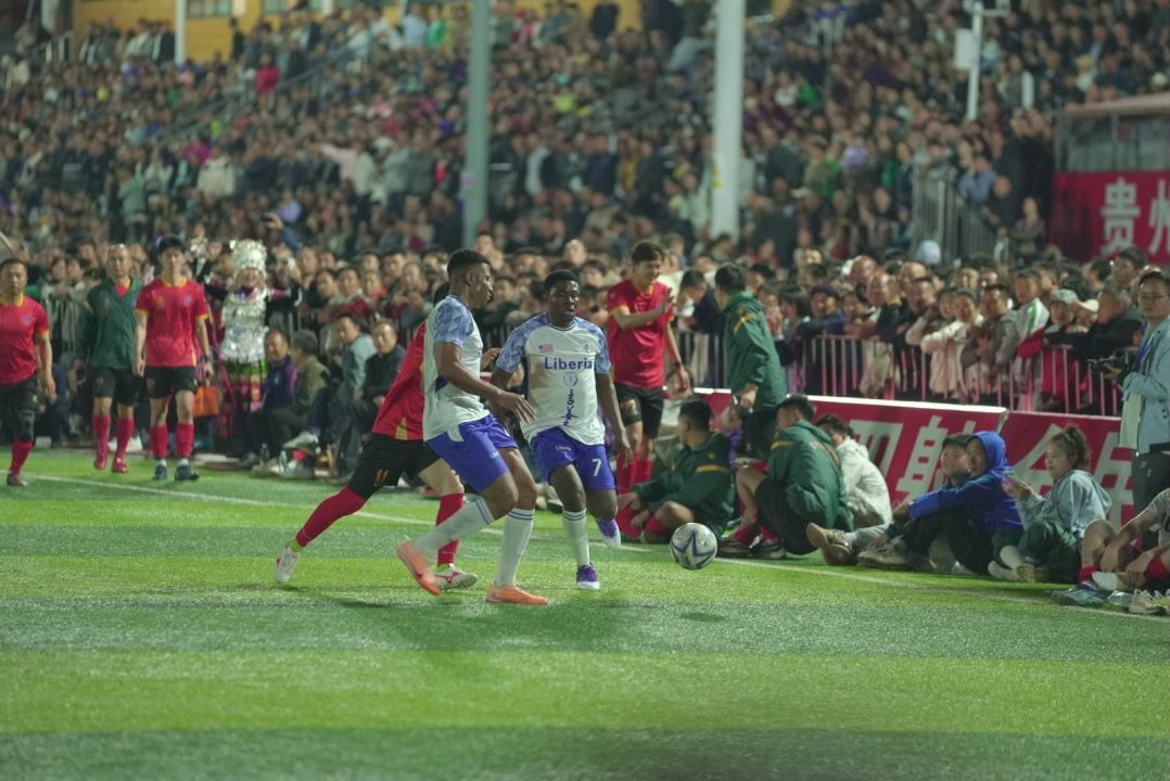 当地时间5月1日晚,非洲利比里亚社联队与辽宁东港草莓队在贵州“村超”球场展开激烈角逐。(图/中新社)