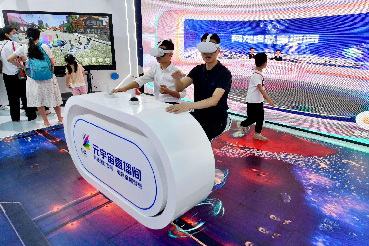 3月1日,中国工业和信息化部部长金壮龙在国务院新闻办新闻发布会上说,将加快布局人形机器人、元宇宙、量子科技等前沿领域,全面推进6G技术研发。图为福州一展会上,元宇宙直播间吸引参观者。(图/中新社)