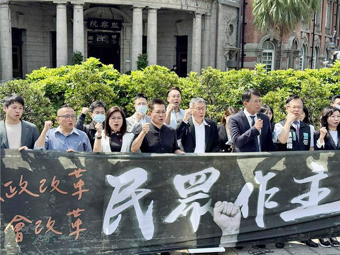 柯文哲9日带领民众党立委在“监察院”前举行记者会,号召民众5月19日上街游行。(图/台北中时新闻网)