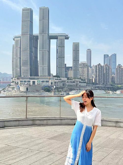 台青林澄仪与重庆地标建筑合影。(图/中新社)