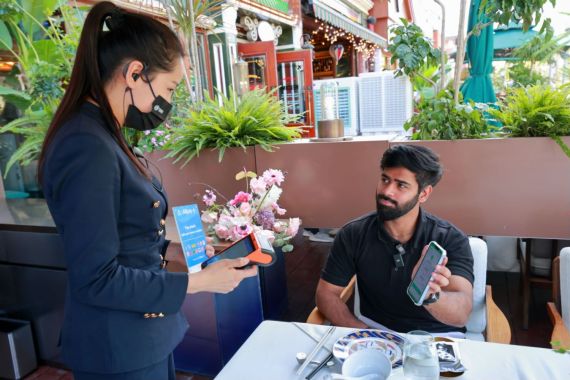 4月8日,游客冉纳在一家餐馆吃完饭后用巴基斯坦“支付宝”——“纳雅贝支付”(NayaPay)进行扫码付款。(图/新华社)