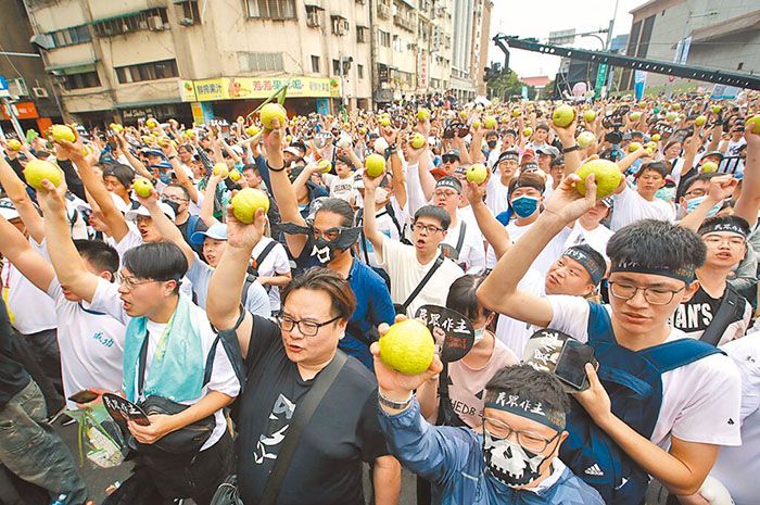综合新华社、台北中时新闻网报道,当天在现场可以看到,许多集会民众手举一颗芭乐,高声抗议民进党过去8年的施政都是“芭乐票”(闽南话谐音,意为无法兑现的空头支票),无论是打击诈骗、社会安全网、能源政策,还是司法改革、“立法院”改革,都与其曾向台湾社会许下的承诺南辕北辙。