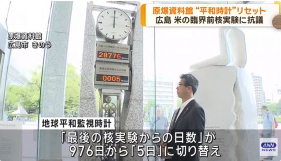 海外网5月20日电 据日本共同社5月20日报道,因美国14日实施亚临界核试验,日本广岛市和平纪念资料馆19日将“地球和平监视钟”显示时间重置,将天数改为“5”。