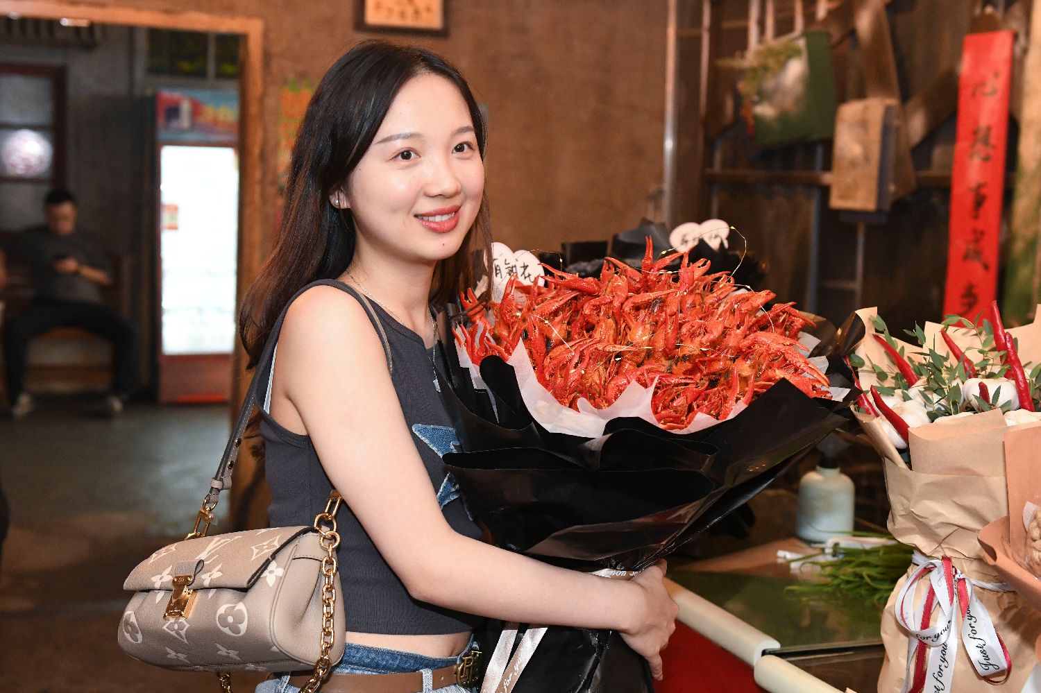 5月20日,顾客手捧由小龙虾制作的花束拍照留念。(中新社)