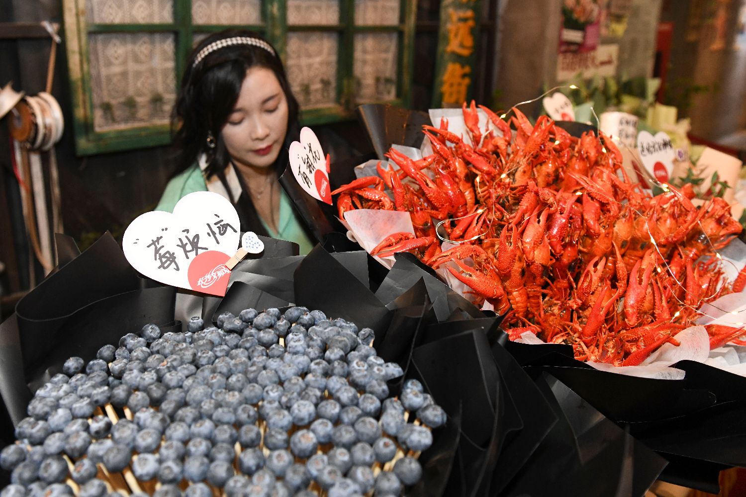 5月20日,店主摆放蓝莓与小龙虾制作的花束。(中新社)