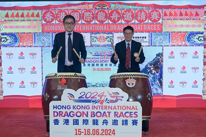5月22日,“香港国际龙舟邀请赛”记者会在香港举行。图为香港旅游发展局总干事程鼎一(左)及中国香港龙舟总会会长劳鉴主持启动仪式。(图/中新社)