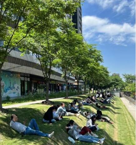 据了解,云锦路地铁站附近这块草坪是一处商圈的配套绿化,呈狭长形、阶梯状。工作日中午,草坪上躺了20多位正在午休的年轻人,大多是附近写字楼的白领上班族。有的独自躺着,有的和同事一起躺着,还有的在聊天,聊生活、聊美食,就是不聊工作。