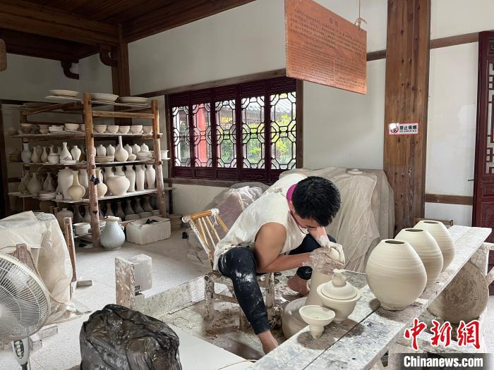5月22日,非物质文化遗产传承人正在景德镇皇窑景区内展示拉坯技艺。李韵涵摄