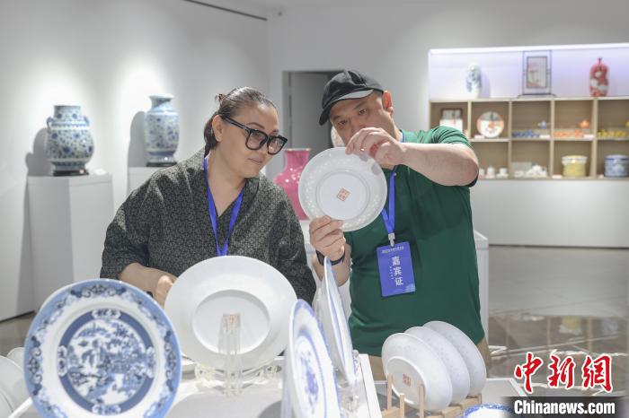 2023年6月18日,江西景德镇,外国驻华使节在欣赏陶瓷文创产品。刘力鑫摄