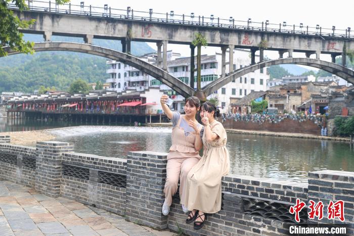 8月26日,江西景德镇市瑶里古镇,游客在河边拍照。 刘力鑫摄