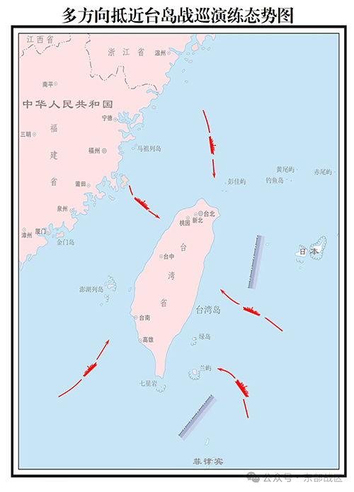 东部战区发布舰艇编队多方向抵近台岛战巡演练态势图。(图/东部战区微信公众号)