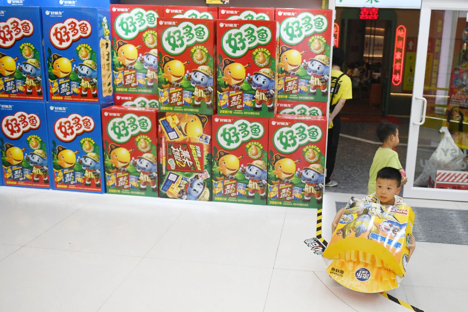5月26日,小朋友搬运特大零食。(中新社)