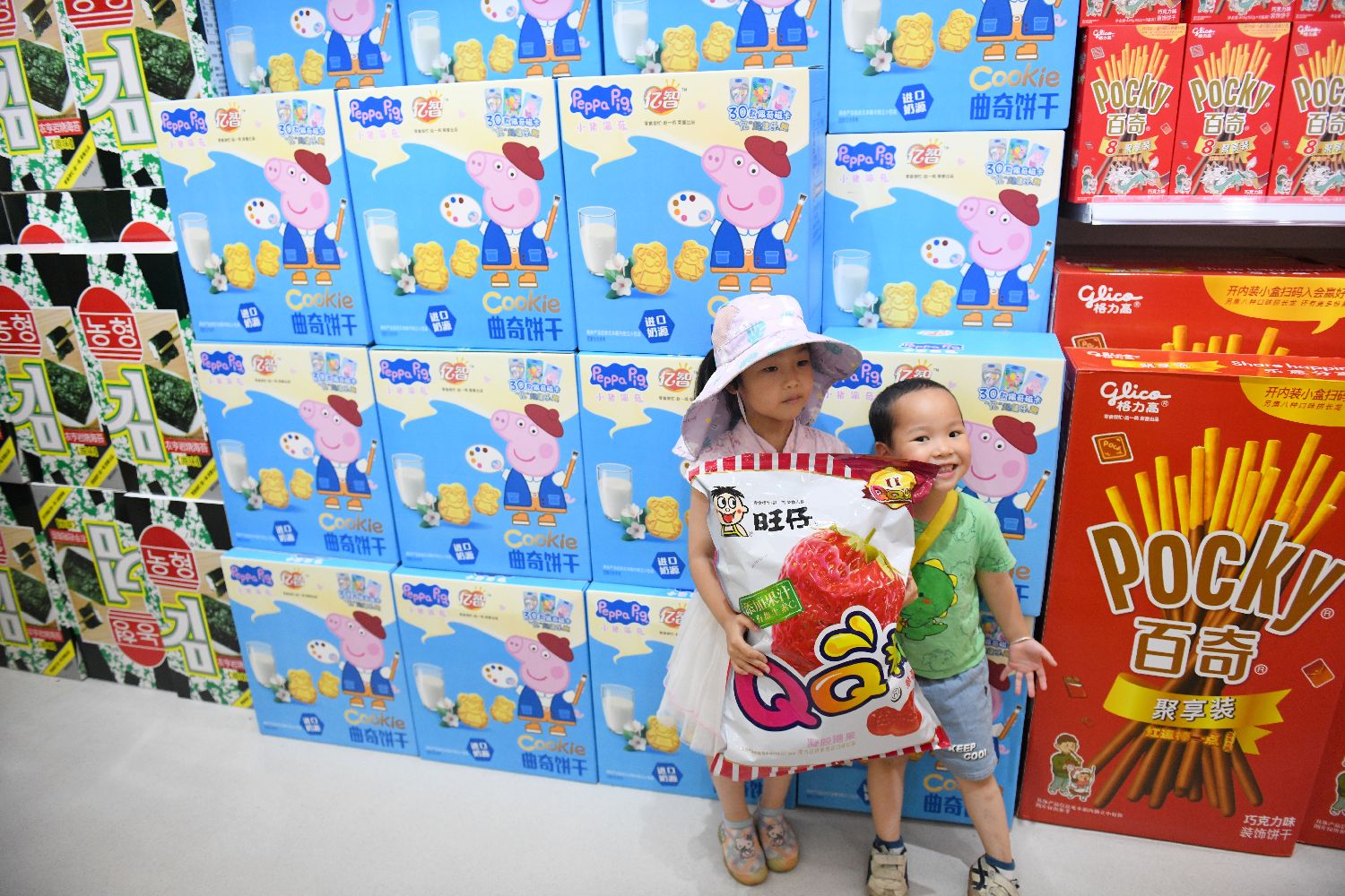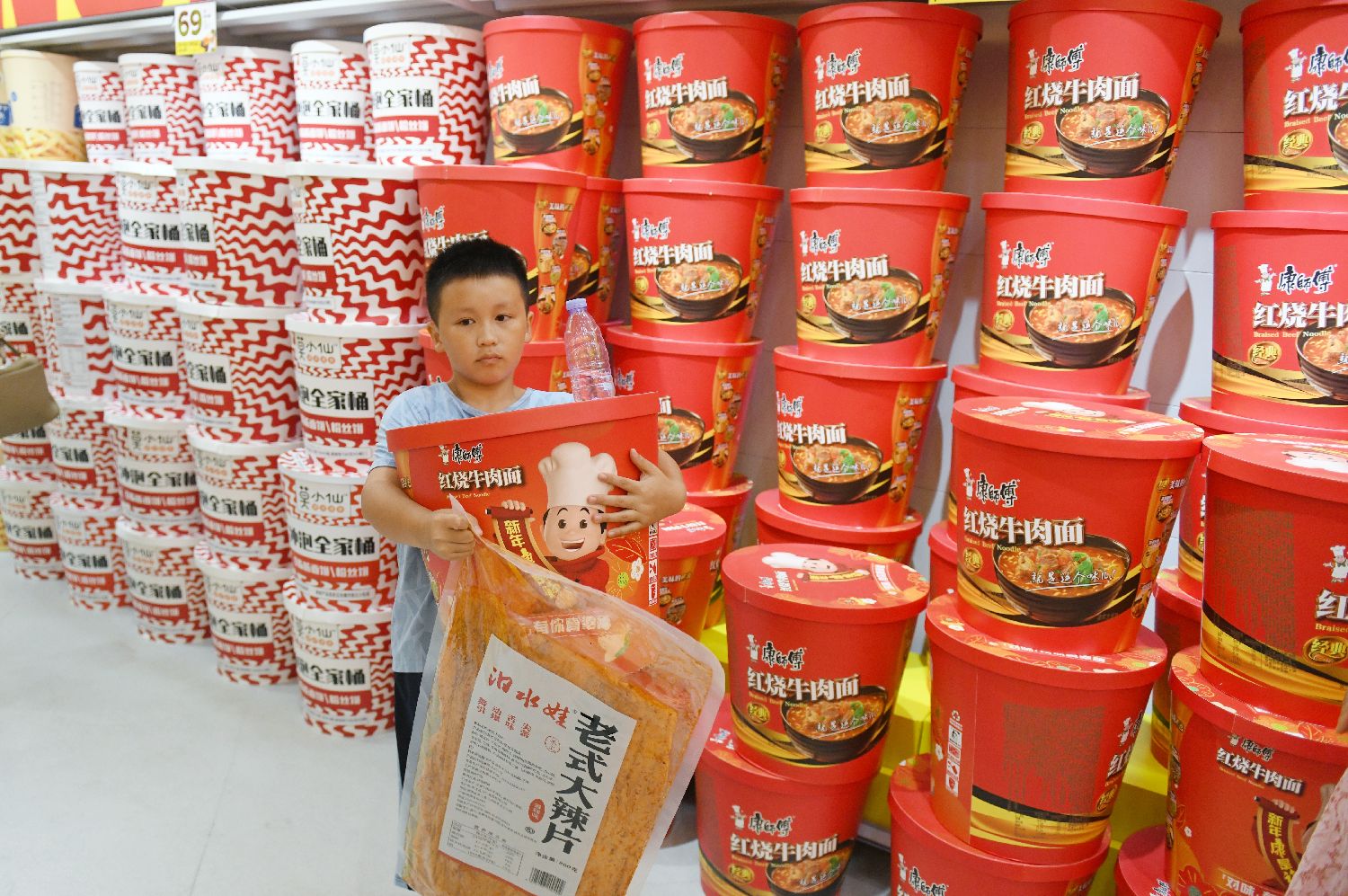 5月26日,小朋友选购巨型方便面。(中新社)