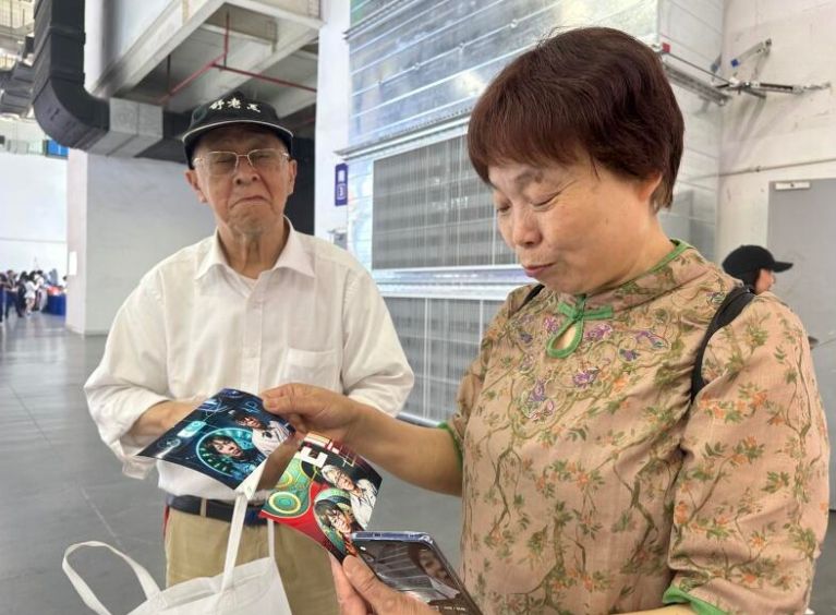 早上7点,79岁的何吉和老伴陈建萍从家中坐5号线换乘522路动漫接驳车到达现场。“别看我们年纪大,我们很喜欢动漫。我喜欢白娘子、花木兰这些由中国文化改编的动漫作品,《长安三万里》我也看了。”何吉指了指身边的老伴说,“她还喜欢画漫画。”