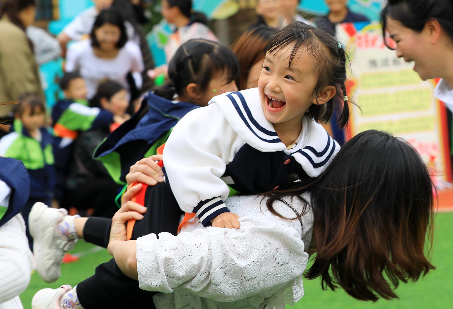 5月29日,在四川省阿坝藏族羌族自治州茂县同心幼儿园,小朋友和家长在趣味比赛中。(新华社)