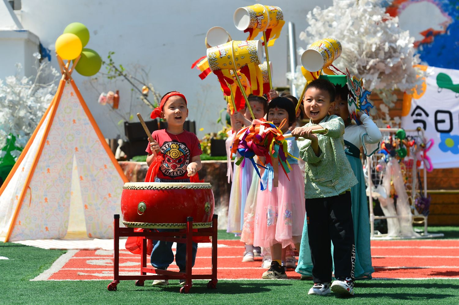 5月29日,小朋友在山东省青岛市市南区新世纪幼儿园迎“六一”活动上击鼓舞龙。“六一”国际儿童节即将到来,各地开展丰富多彩的庆祝活动。(新华社)