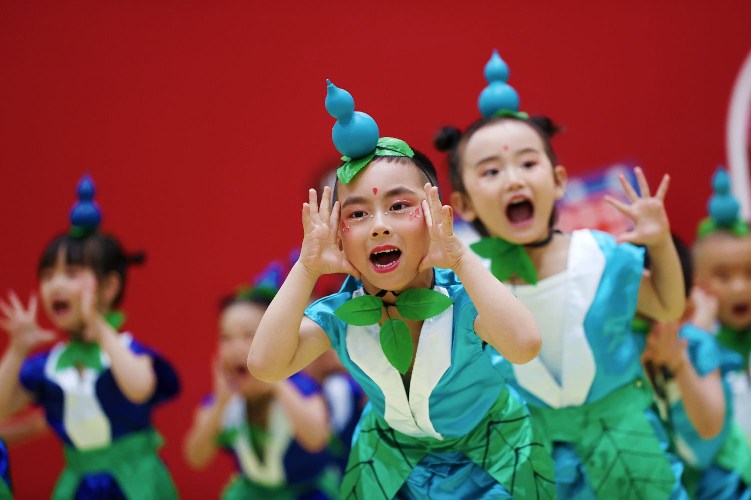 5月29日,重庆市黔江区妇联幼儿园的小朋友在表演情景剧《葫芦娃》。(新华社)