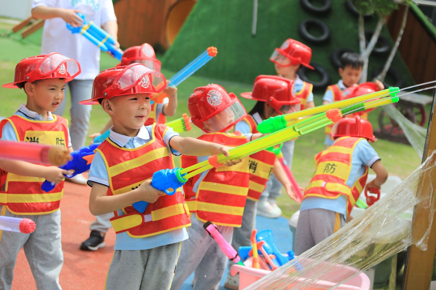 5月29日,浙江省舟山市新城翁浦幼儿园小朋友在职业体验活动中体验消防员灭火。(新华社)