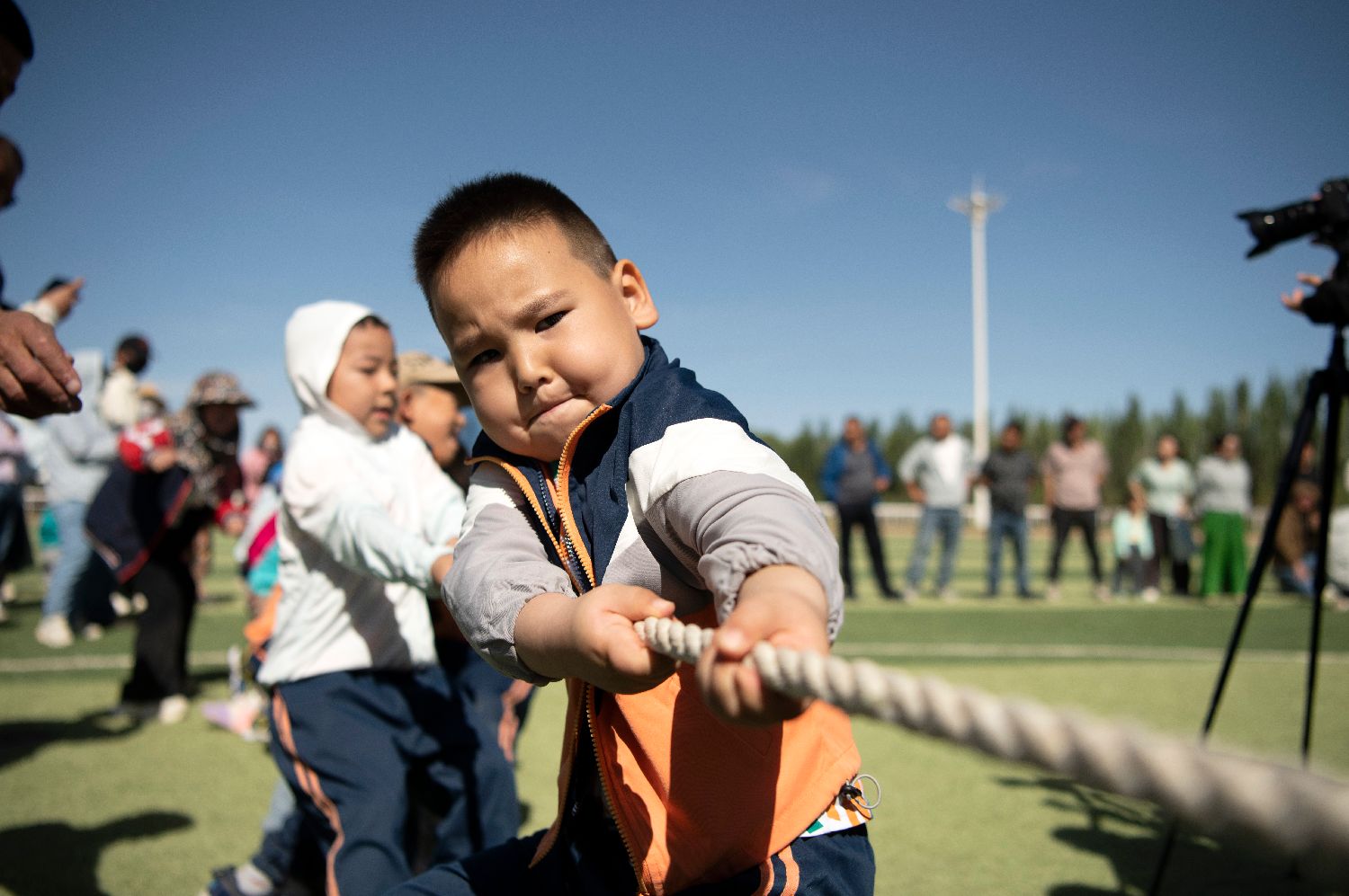5月29日,在甘肃阿克塞哈萨克族自治县赛马场,小朋友们参加拔河比赛。(新华社)