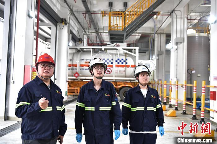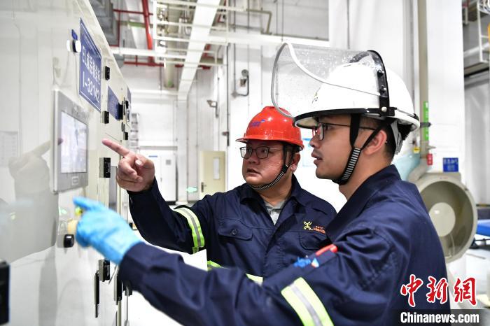 5月21日,福建天甫电子材料有限公司常务副总经理刘奕丰(左)和同事在工作中。 中新社记者张斌摄