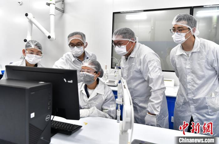 5月21日,福建天甫电子材料有限公司常务副总经理刘奕丰(右二)和他的团队成员在工作中。 中新社记者张斌摄