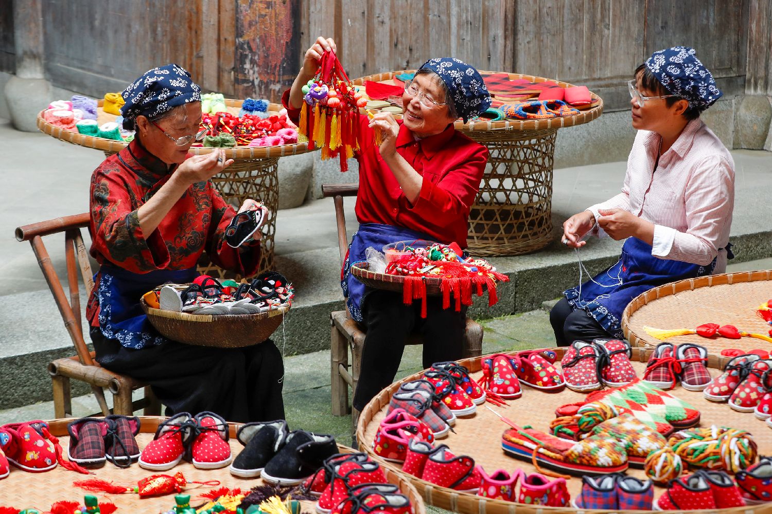 6月4日,村民在手工缝制非遗“徽州端午锦”。(中新社)