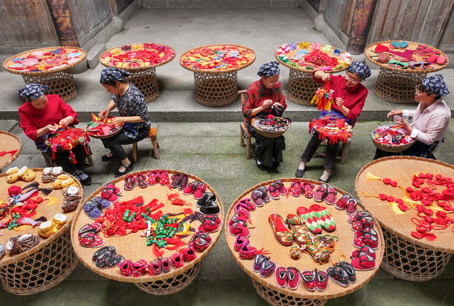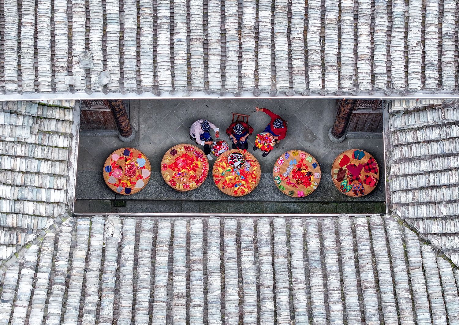 6月4日,无人机拍摄的村民在手工缝制非遗“徽州端午锦”。(中新社)