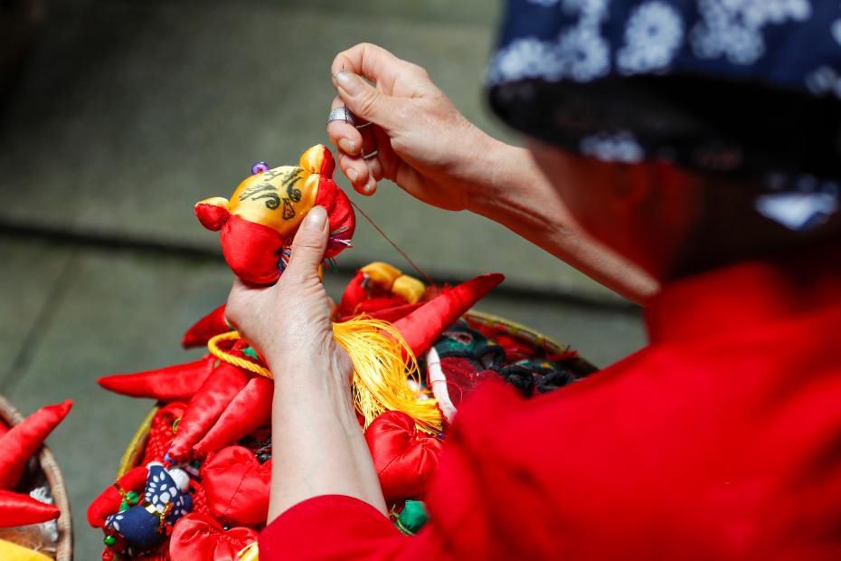 6月4日,村民在手工缝制“老虎”形状的非遗“徽州端午锦”。(中新社)